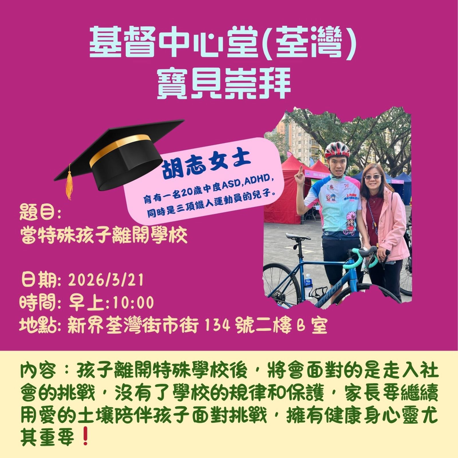 講者:胡志女士(育有20歲中度ASD、ADHD,同時是三項鐵人運動員的兒子)